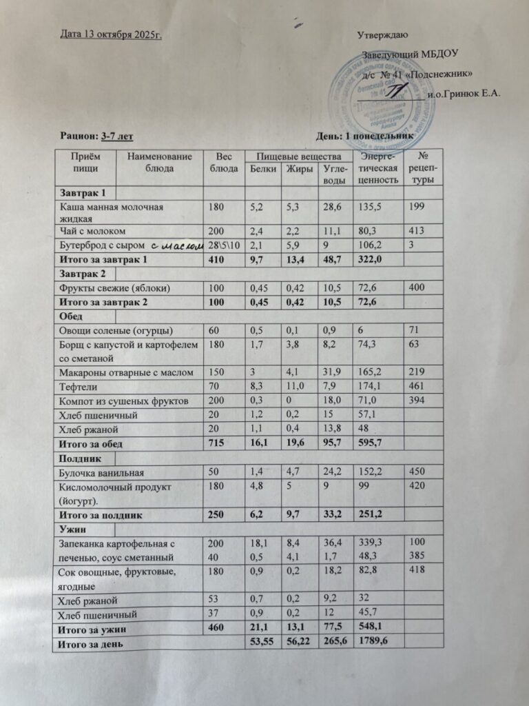 Индивидуальное меню | в ДОУ не осуществляется ( нет детей, нуждающихся в лечебном и диетическом питании) |